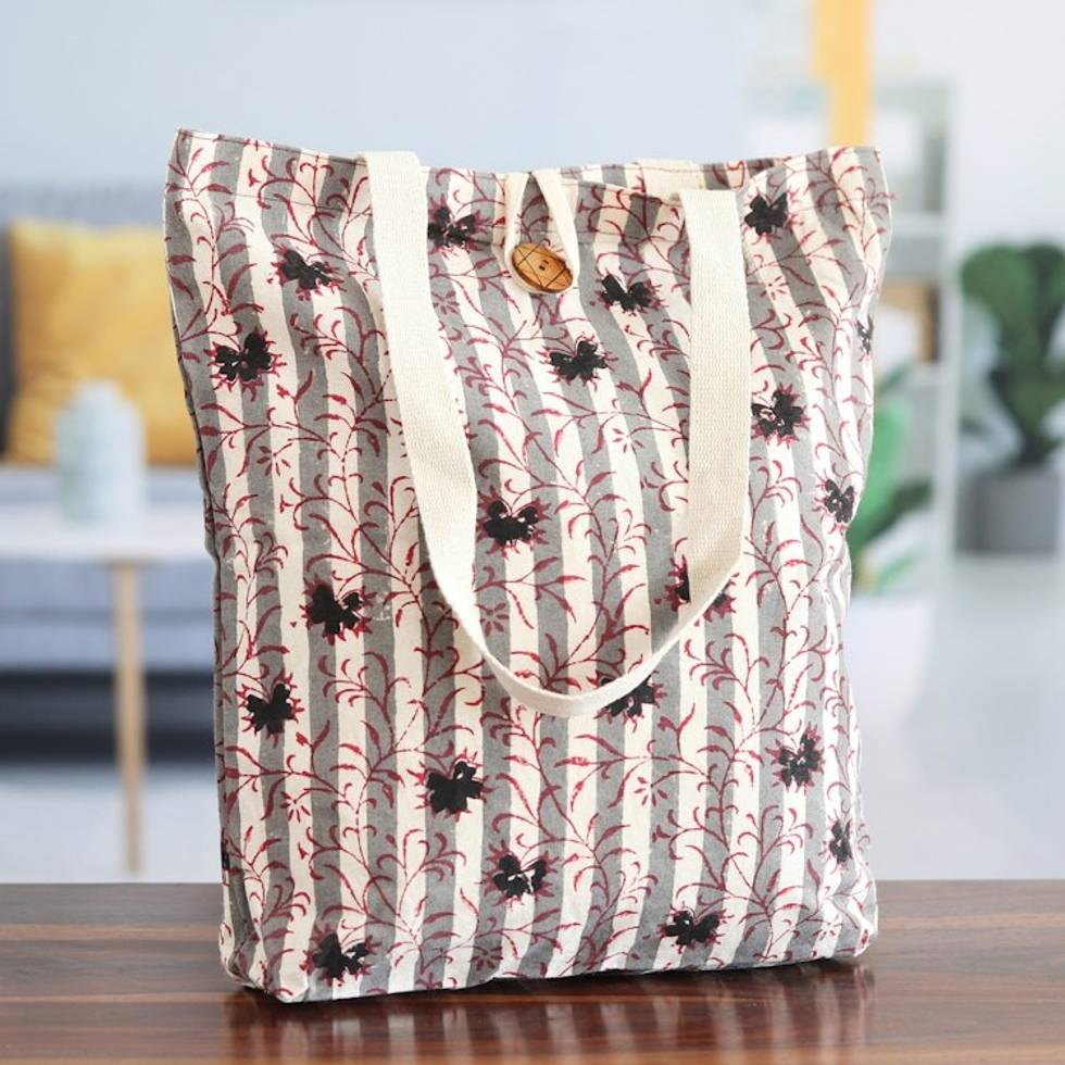 Leafy Block-Printed Cotton Tote Bag in Red and Grey 'Red Vines' Item ID: 2671786994