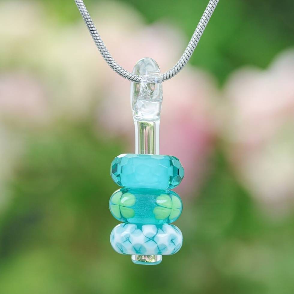 Leafy Blue and Green Glass Beaded Pendant Necklace 'Lucky Amulets' Item ID: 2671796855