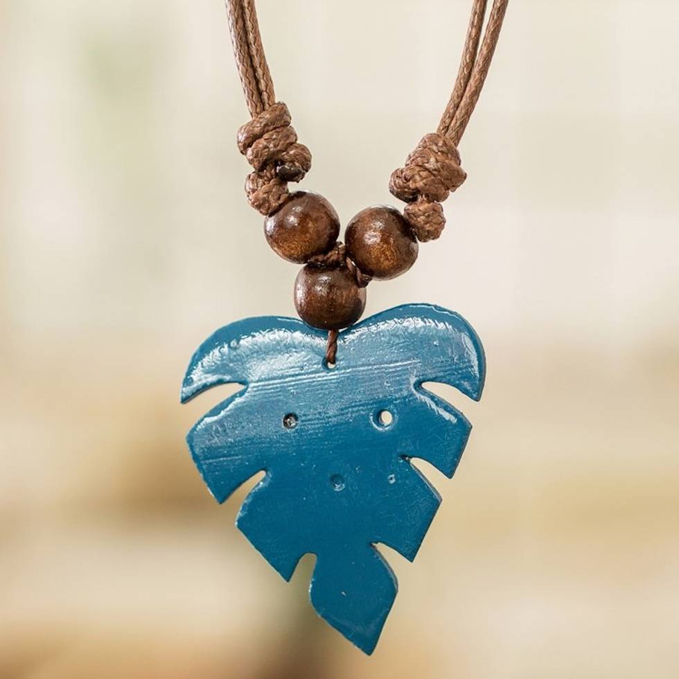 Leafy Blue Calabash Gourd Pendant Necklace with Wood Beads 'Jungle Blue' Item ID: 2671769256