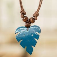 "The vitality and magical energy of the Costa Rican forests inspire a bewitching design that captures the essence of the tropical jungle. Artisan Kattia Lopez uses a calabash gourd to create the leaf pendant that adorns this unique necklace, painting it in a graceful blue hue that symbolizes wisdom. As a way to enrich the design's natural aura, Kattia adds pinewood beads to the brown cord and finishes the accessory with a convenient sliding knot that can be adjusted to your liking."