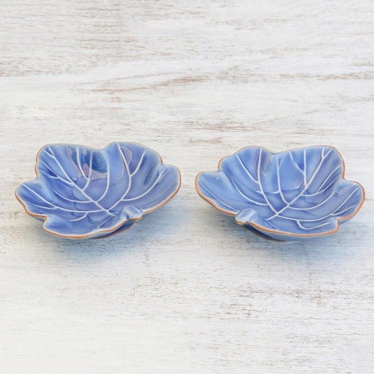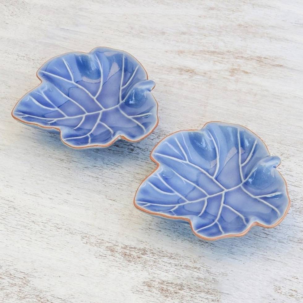 Leafy Blue Ceramic Appetizer Bowls from Thailand Pair 'Ivy Gourd' Item ID: 2671798795