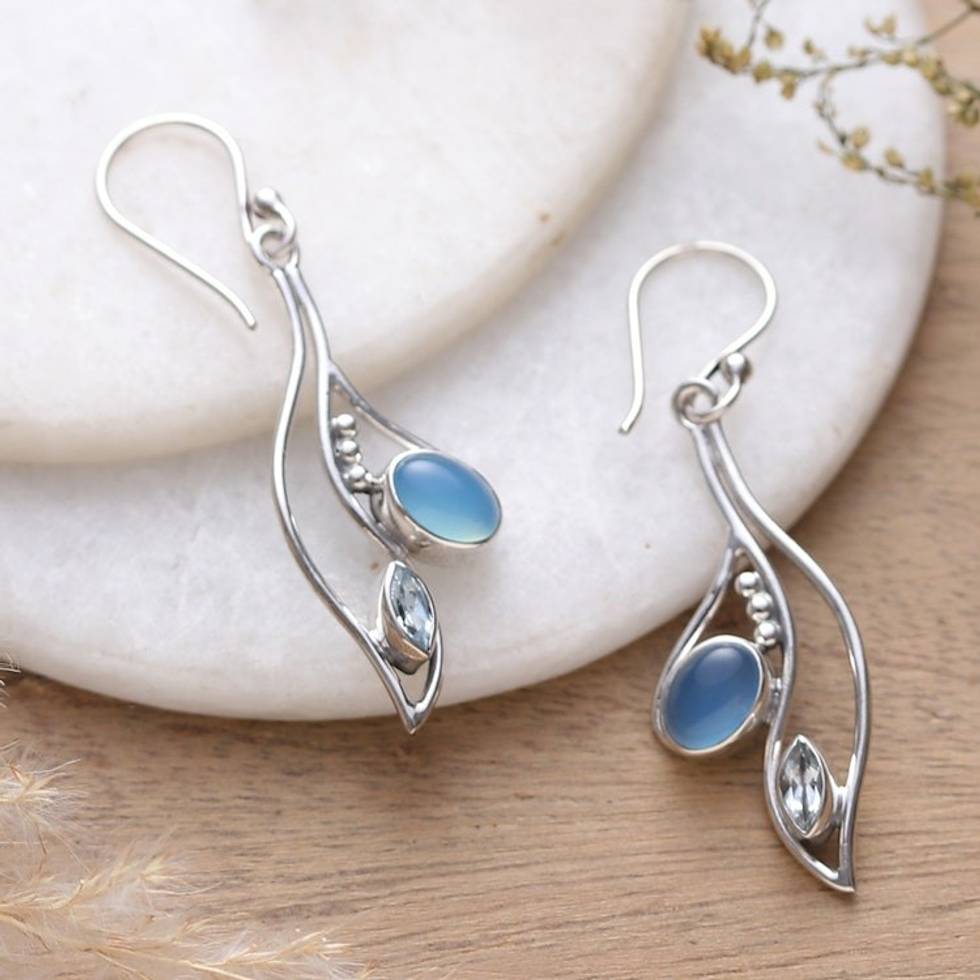 Leafy Chalcedony and Blue Topaz Dangle Earrings from India 'Healing Harmony' Item ID: 2671783016
