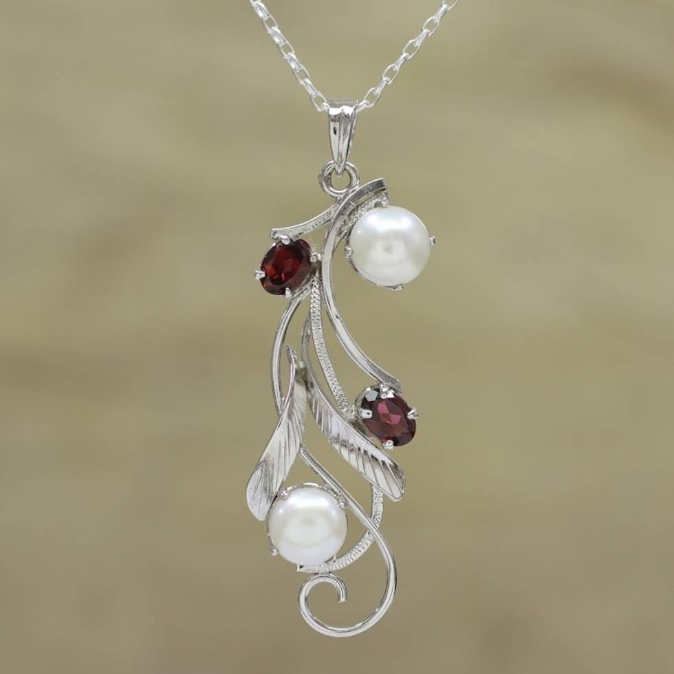 Leafy Garnet and Cultured Pearl Pendant Necklace from India 'Eternal Glamour' Item ID: 2671619369