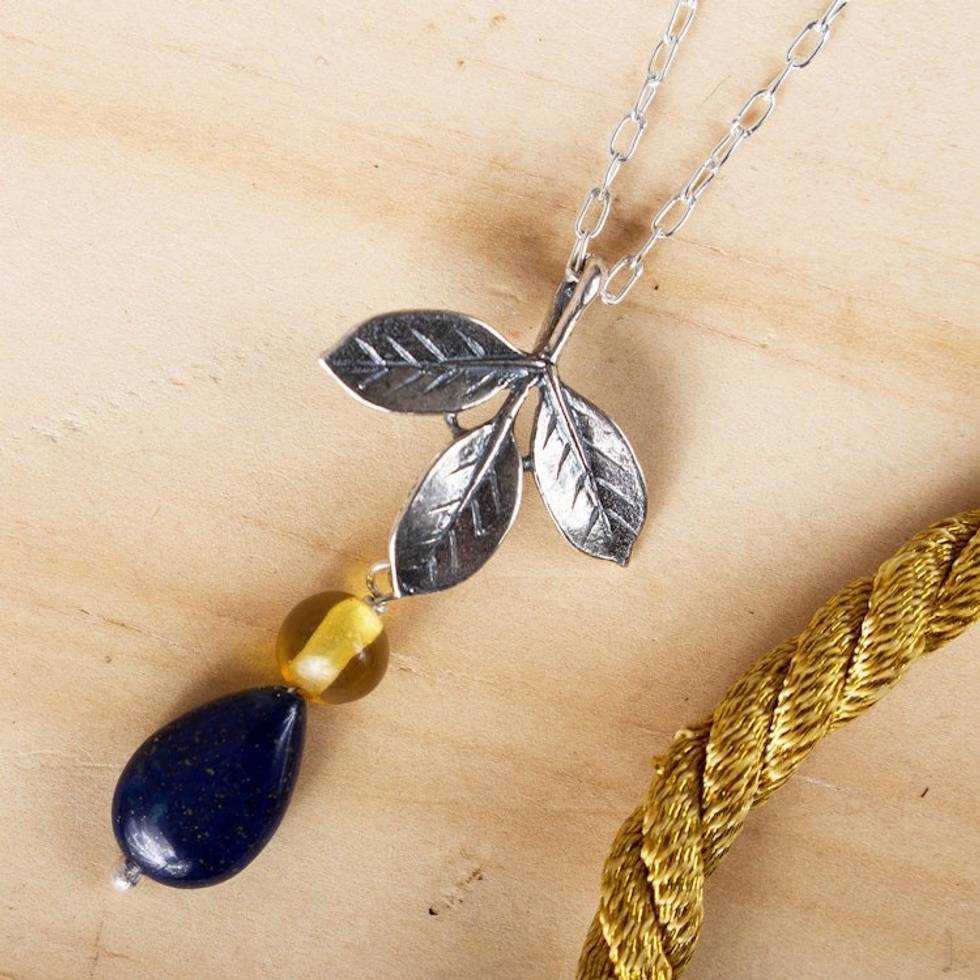 Leafy Lapis Lazuli and Amber Pendant Necklace from Mexico 'Indigo Foliage' Item ID: 2669926773