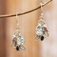 these earrings have the perfect color multi stones. they are designed perfectly symmetrical and hang perfectly R/L ears. light weight, beautiful presence, feminine and hang on ears so beautifully. very very pleased and impressed and happy with this purchase. Oh! also the ear wires are thin and easily go thru holes in ears. I have other multi stone jewelry that I've been waiting to find matching earrings. great job!!!!!!!