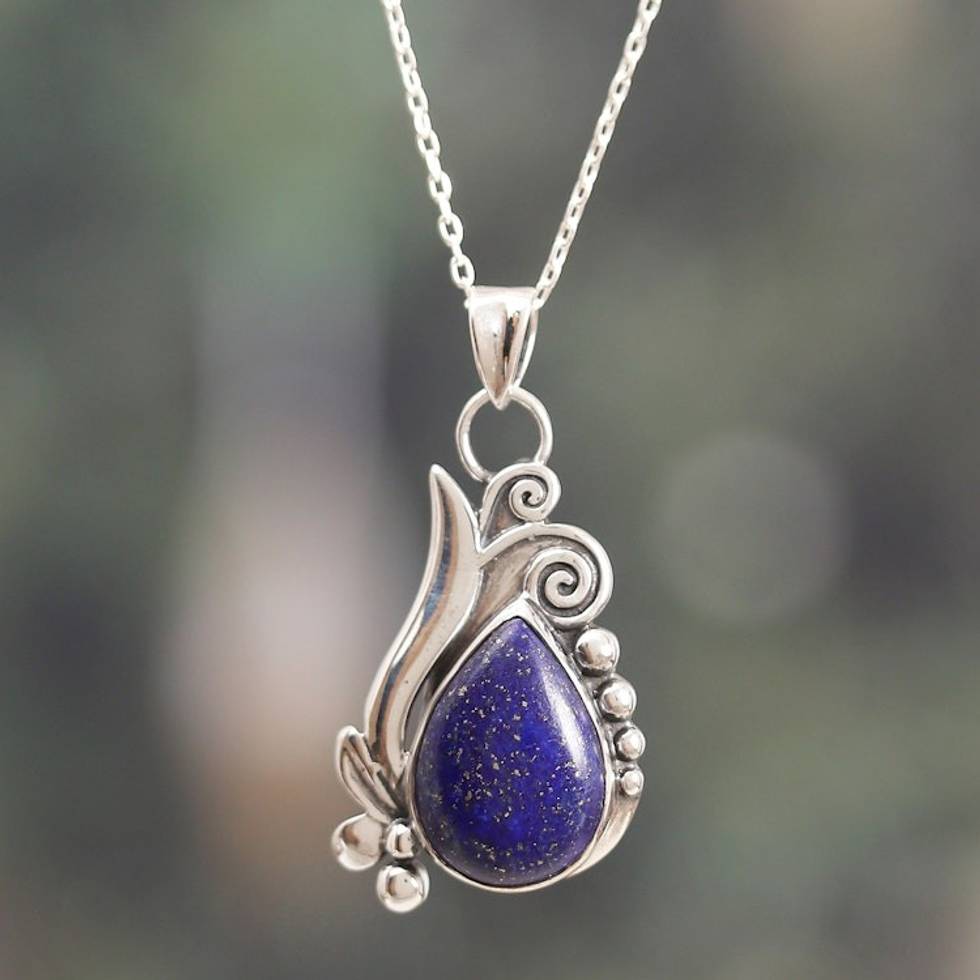Leafy Polished Sterling Silver Lapis Lazuli Pendant Necklace 'Grand Blue' Item ID: 2671782165
