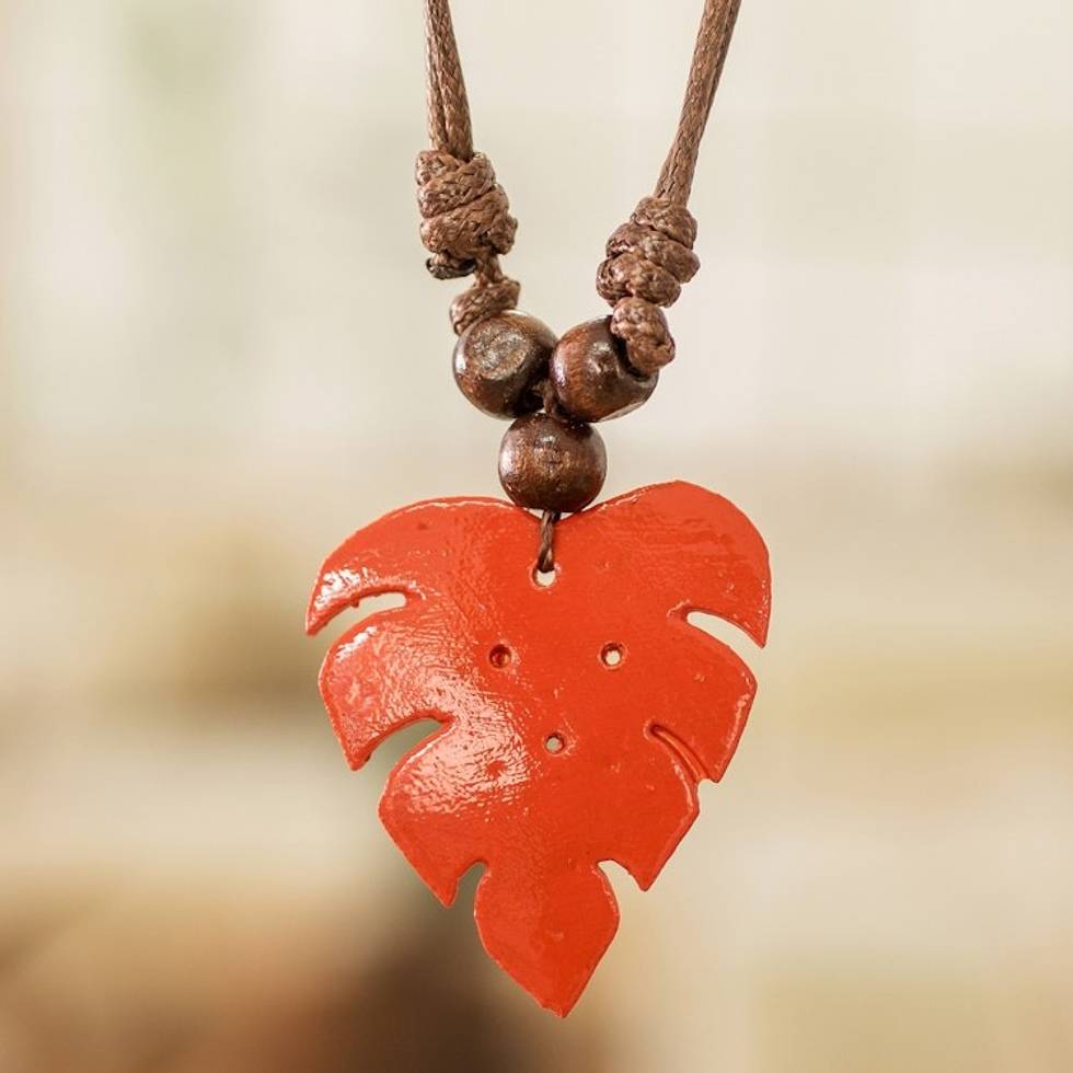 "The vitality and magnetic energy of the Costa Rican forests inspire a sublime design that captures the essence of the tropical jungle. Artisan Kattia Lopez uses a calabash gourd to create the leaf pendant that ornaments this unique necklace, painting it in a vibrant red hue that symbolizes passion. As a way to enrich the design's natural aura, Kattia adds pinewood beads to the brown cord and finishes the accessory with a convenient sliding knot that can be adjusted to your liking."