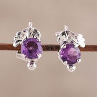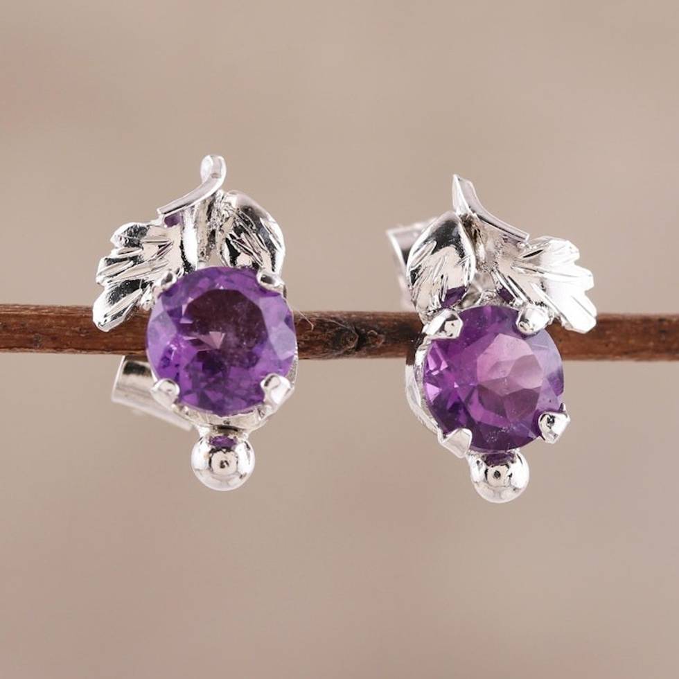 Leafy Rhodium Plated Amethyst Stud Earrings from India 'Nature Leaf' Item ID: 2669924414