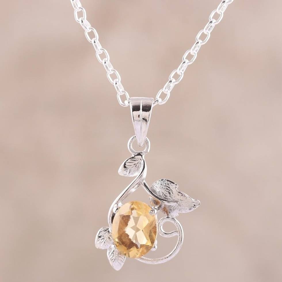 Leafy Rhodium Plated Citrine Pendant Necklace from India 'Glittering Blossom' Item ID: 2671792214