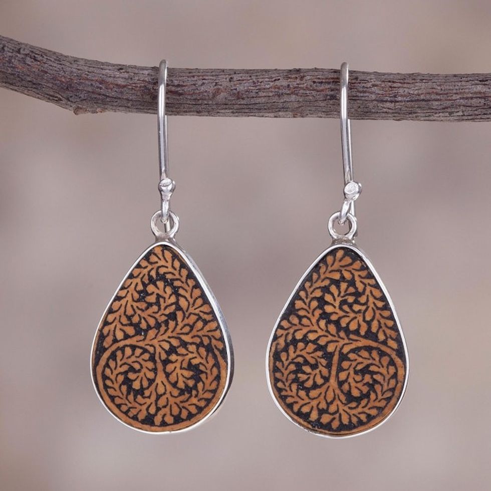 Leafy Sterling Silver and Pumpkin Shell Earrings from Peru 'Enchanted Copse' Item ID: 2669919672