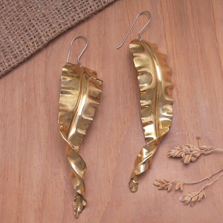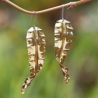 "Little dazzling leaves dance gracefully in a stunning design by Agus Suryanto from Bali. Inspired by the fascinating regional flora, the artisan creates these brass dangle earrings in a high polish finish. In addition, stainless steel hooks allow you to wear the accessory comfortably."