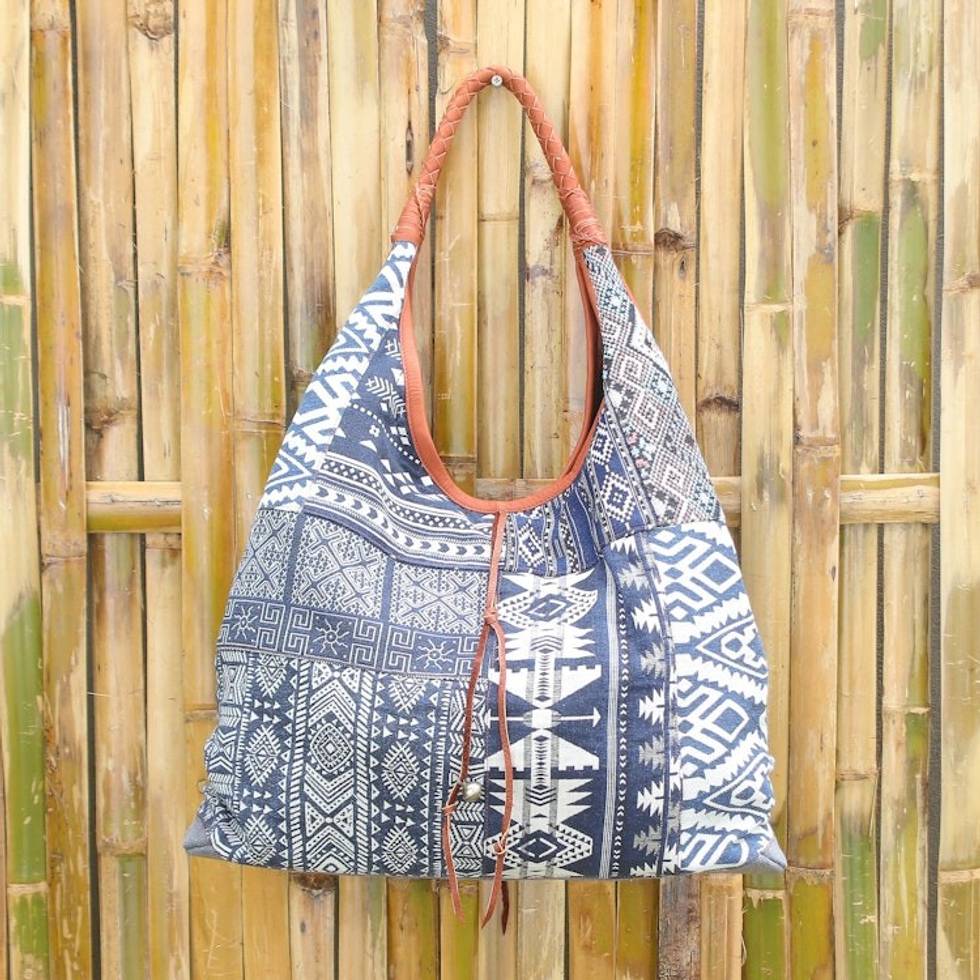 Leather Accent Cotton Blend Hobo Bag in Lapis and White 'Lapis Geometry' Item ID: 2669897505