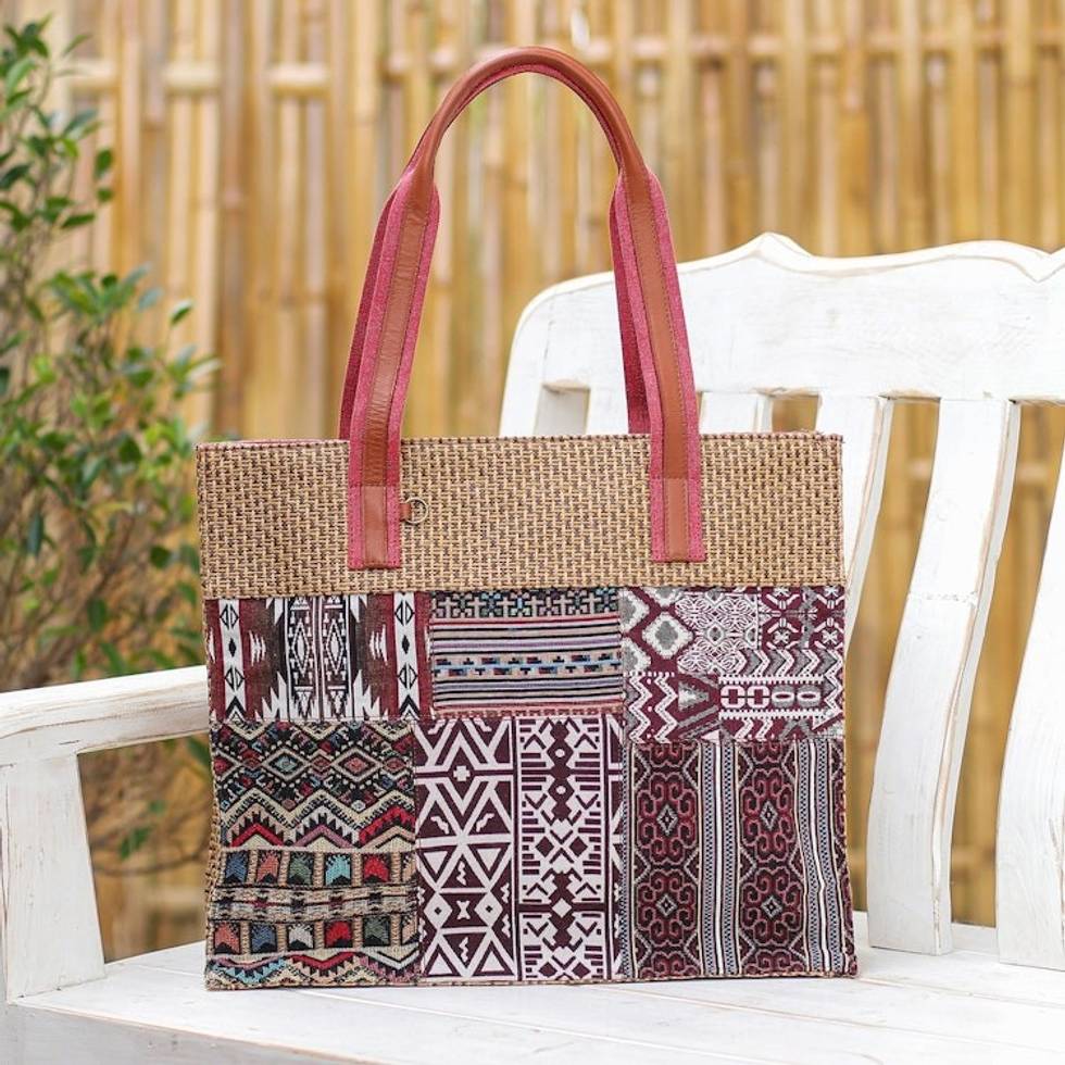 Leather-Accented Cotton Blend Tote Bag 'Chill Night in Red' Item ID: 2671799888