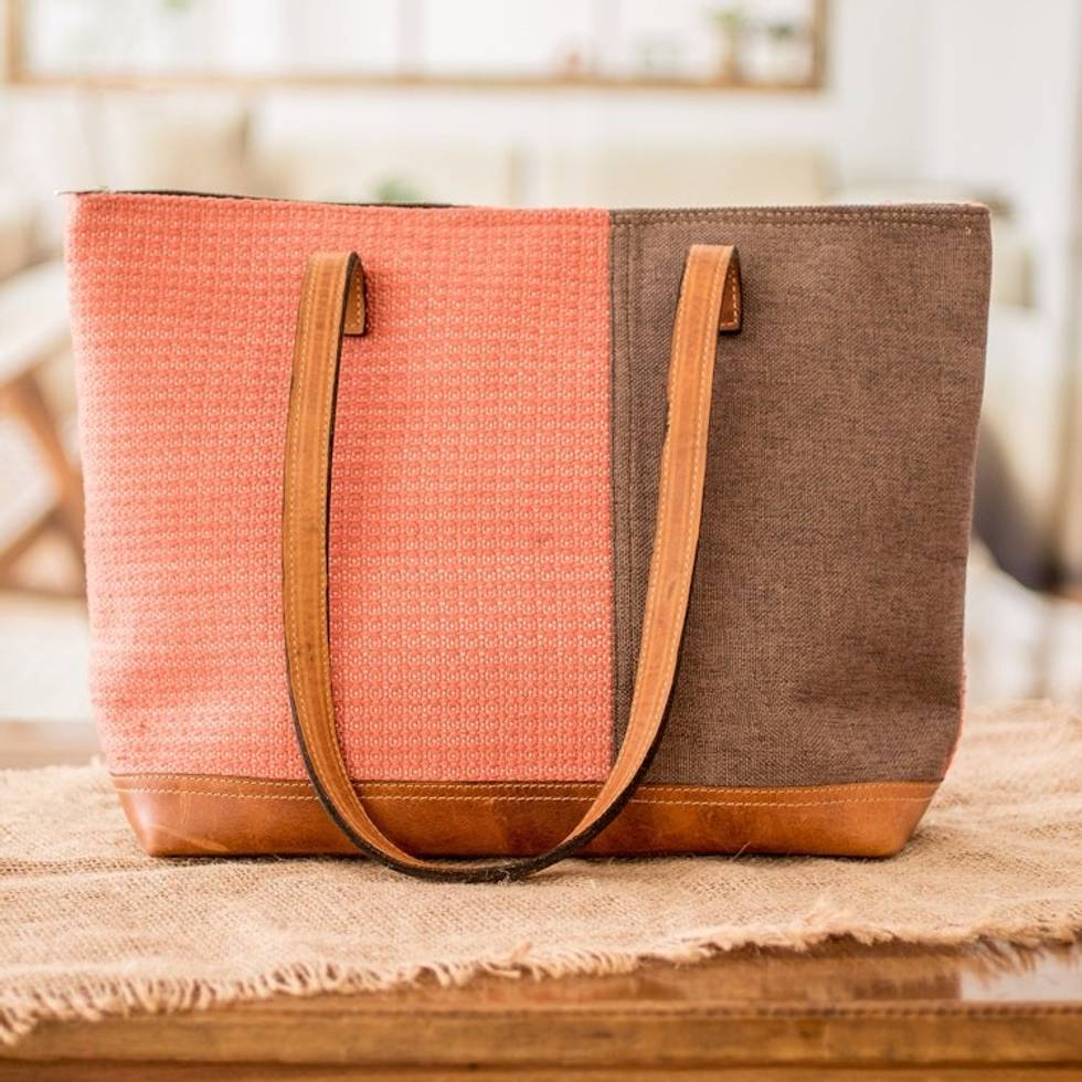 "Elegance and sweetness merge in one graceful design crafted by the talented artisans of the Life and Hope Women's Association (Asociacion de Mujeres Vida y Esperanza) from Guatemala. Accented with leather handles, a zippered back compartment, an interior pocket and a zipper closure, this gorgeous shoulder bag has a cotton structure adorned with a pattern in light taupe and salmon hues, perfect for a chic ensemble."