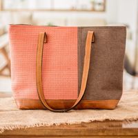 Leather-Accented Cotton Shoulder Bag in Salmon and Taupe 'Salmon Diversity' Item ID: 2671626784