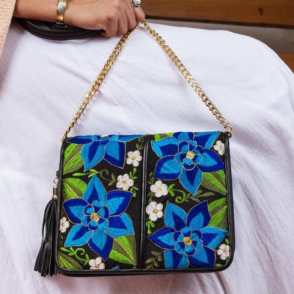 Leather Accented Cotton Sling with Blue Floral Embroidery 'Yucatan Flowers' Item ID: 2671808866