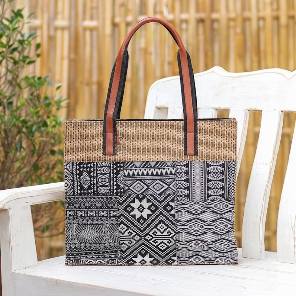 Leather-Accented Patchwork Tote Bag 'Chill Night in Black' Item ID: 2671799777