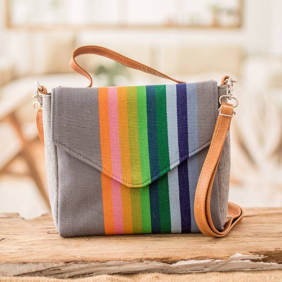 Leather-Accented Striped Cotton Sling Bag in Grey Base Hue 'Pewter Fate' Item ID: 2671770212