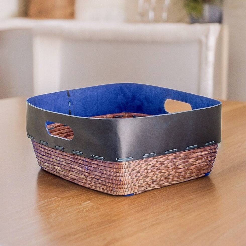 Leather and Pine Needle Decorative Basket from Nicaragua 'Bold Blue Beauty' Item ID: 2671771864