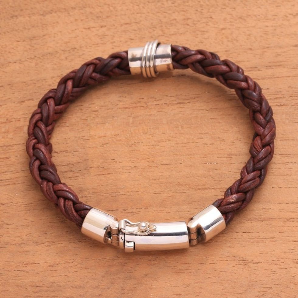 Leather and Sterling Silver Braided Bracelet from Bali 'Bonding Weave' Item ID: 2671821321
