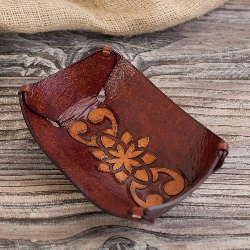 Leather Catchall in Honey Brown Artisan Crafted in Peru 'Floral Star' Item ID: 2671695535