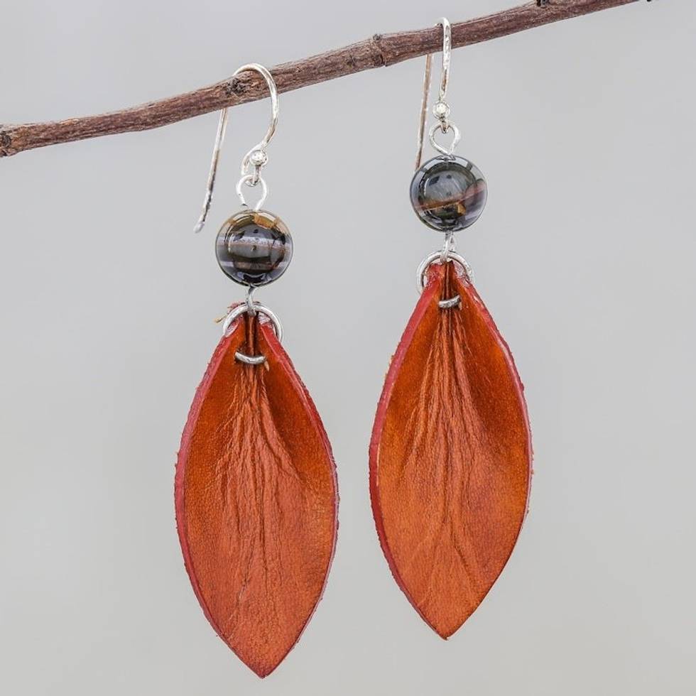 Leather Petal Earrings with Tiger's Eye Beads 'Supple Petals in Rust' Item ID: 2671798303