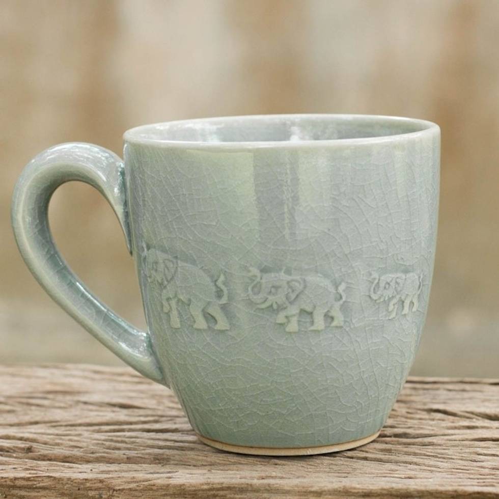 Light Blue Elephant Theme Celadon Ceramic Mug 'Blue Elephant Walk' Item ID: 2671802185
