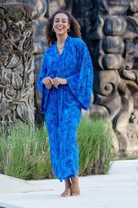 Long Handcrafted Batik and Tie Dyed Rayon Robe from Bali 'Misty Ocean' Item ID: 2669914053