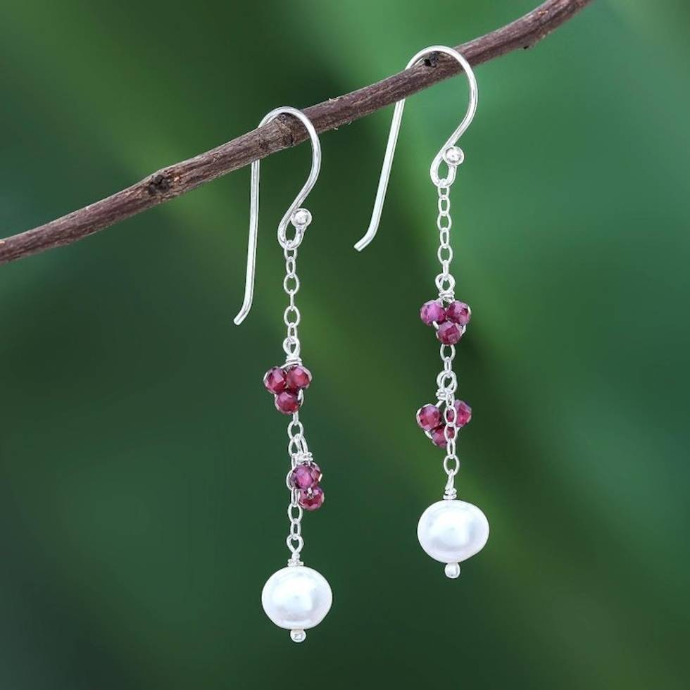 Long Sterling Silver Garnet and Pearl Earrings 'Sweet Essence' Item ID: 2671641681