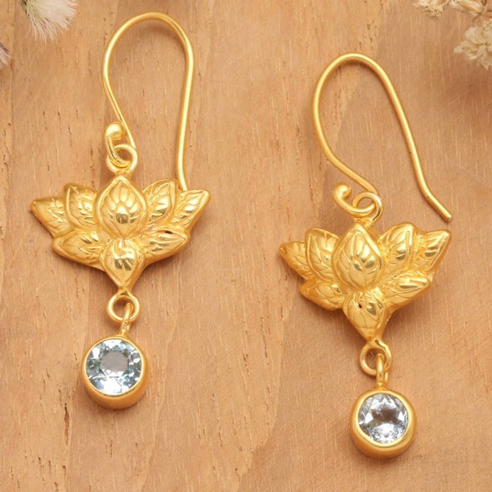 Lotus-Shaped 22k Gold-Plated Blue Topaz Dangle Earrings 'Brahman's Blue Jewel' Item ID: 2671562451