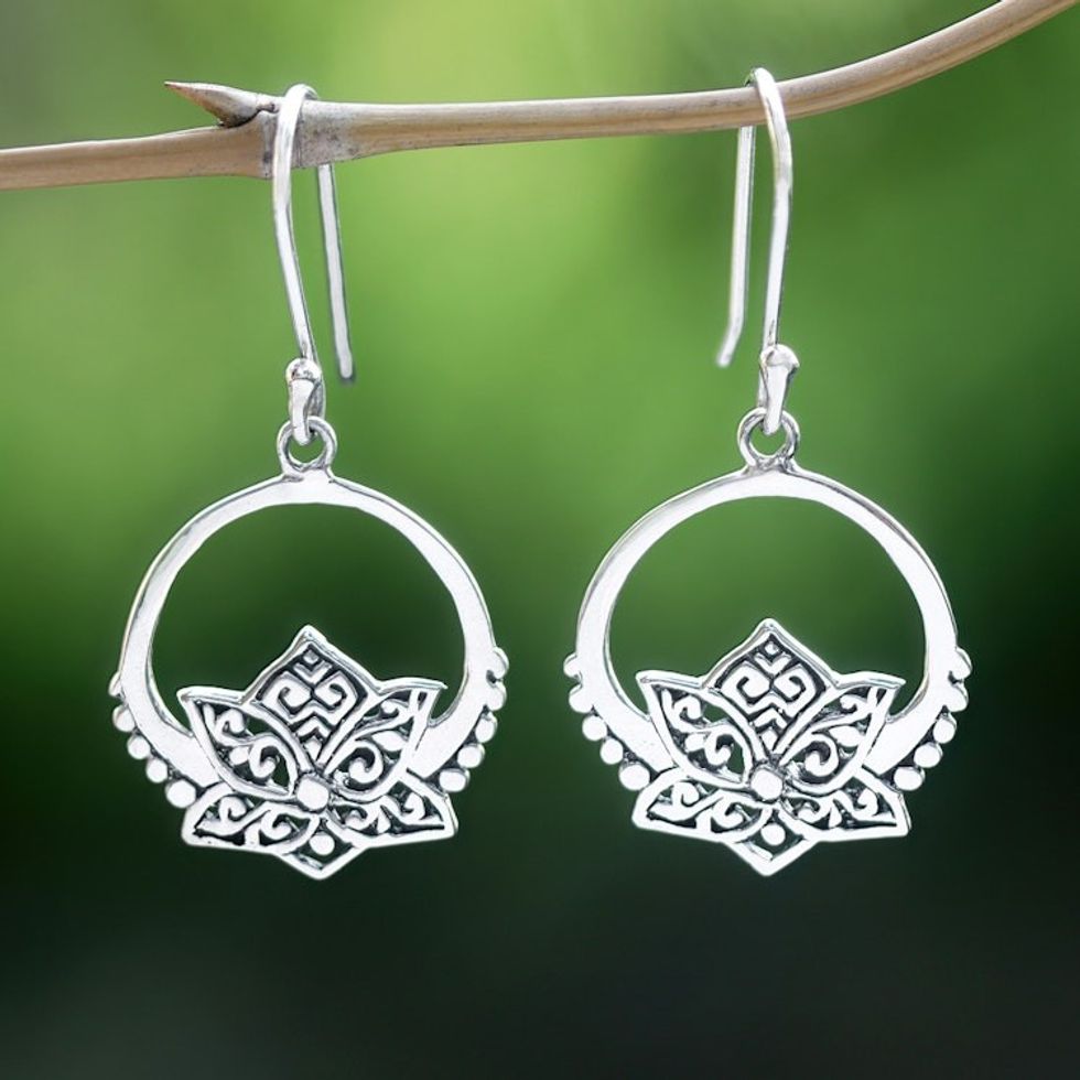 Lotus-Themed Sterling Silver Dangle Earrings Made in Bali 'Lotus Pond' Item ID: 2671557671