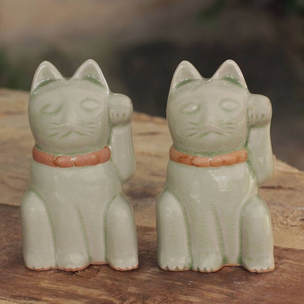 Lucky Cat Thai Celadon Ceramic Figurines in Green Pair 'Lucky Green Cat' Item ID: 2671802498