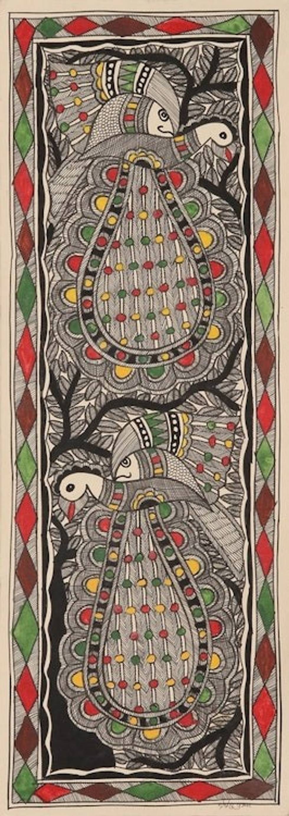 Madhubani Bird and Tree Painting on Handmade Paper 'Peaceful Unity' Item ID: 2671788800