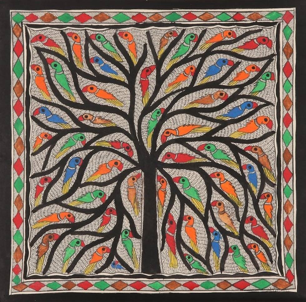 Madhubani Bird Painting on Handmade Paper 'Cheerful Chirps' Item ID: 2671788945