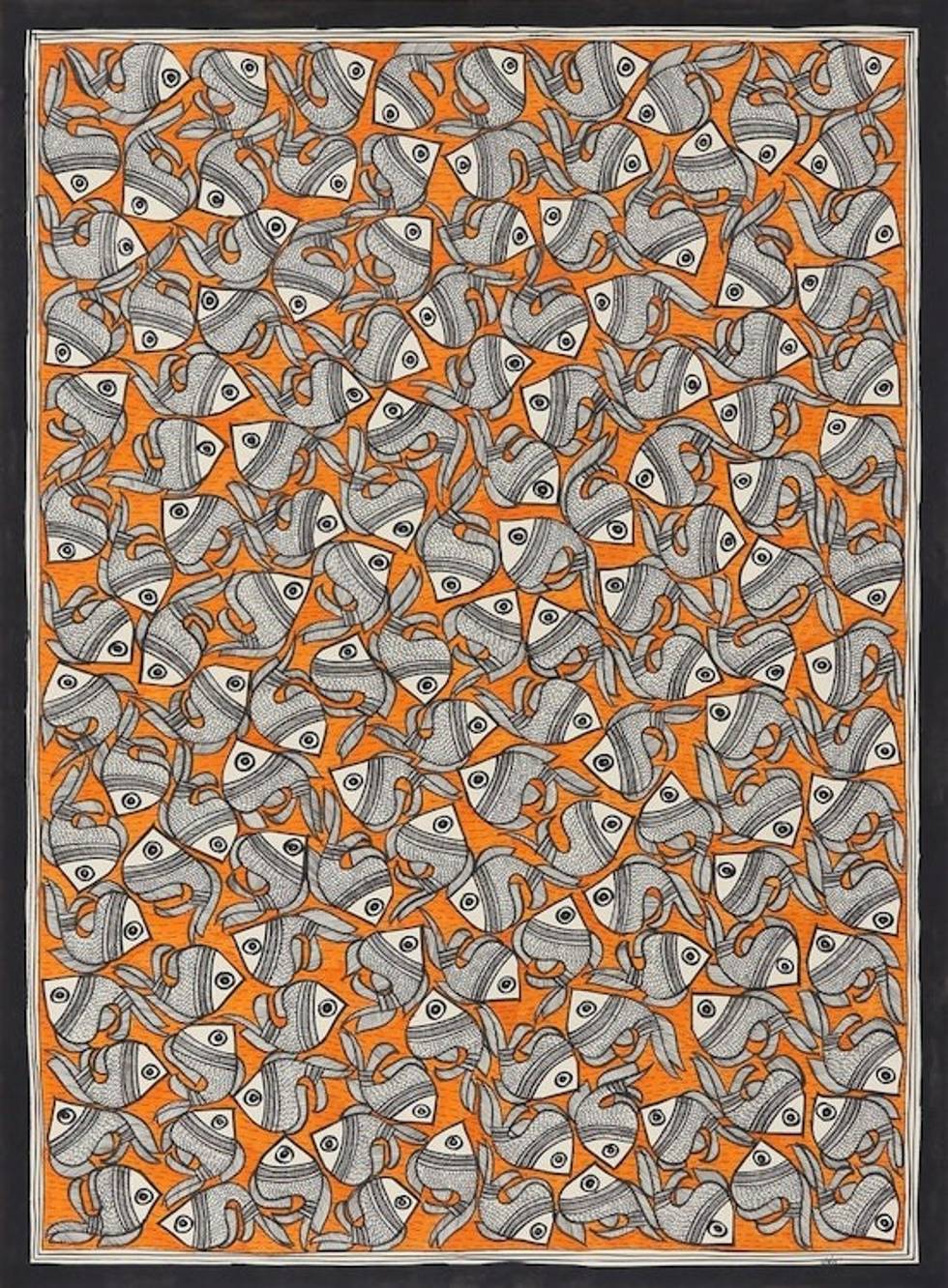 Madhubani Fish Painting in Orange from India 20.5x29 'Fish Harmony' Item ID: 2671792360