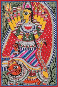 Madhubani Goddess Painting on Handmade Paper 'Majestic Durga' Item ID: 2669892346