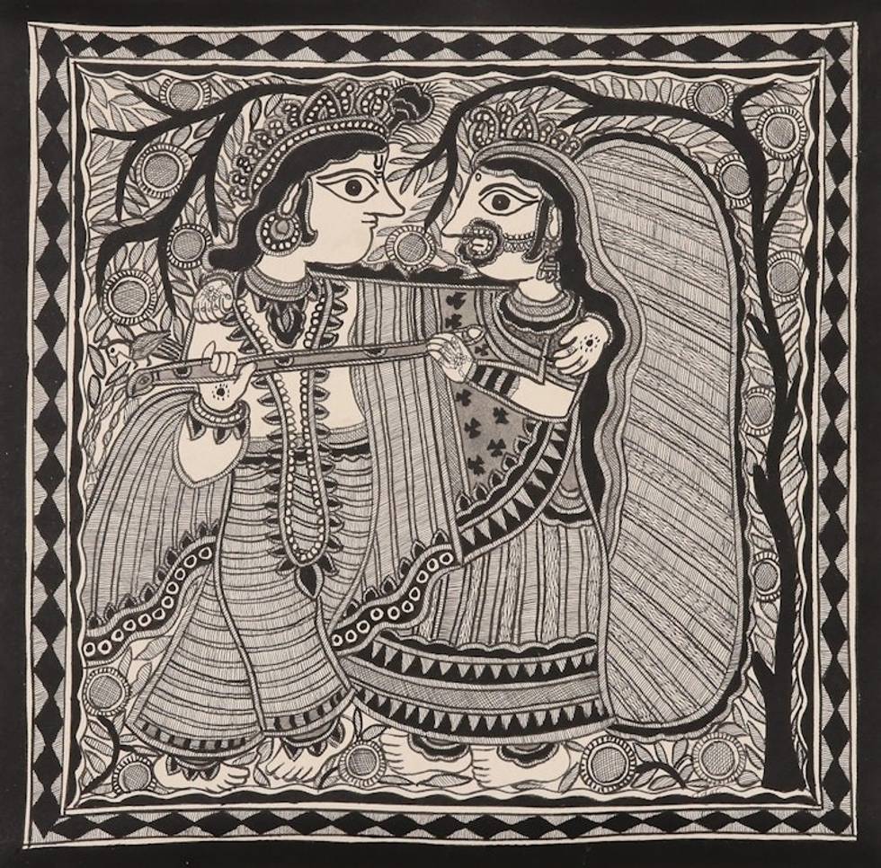 Madhubani Krishna Painting on Handmade Paper 'Radha and Krishna's Love' Item ID: 2671789131