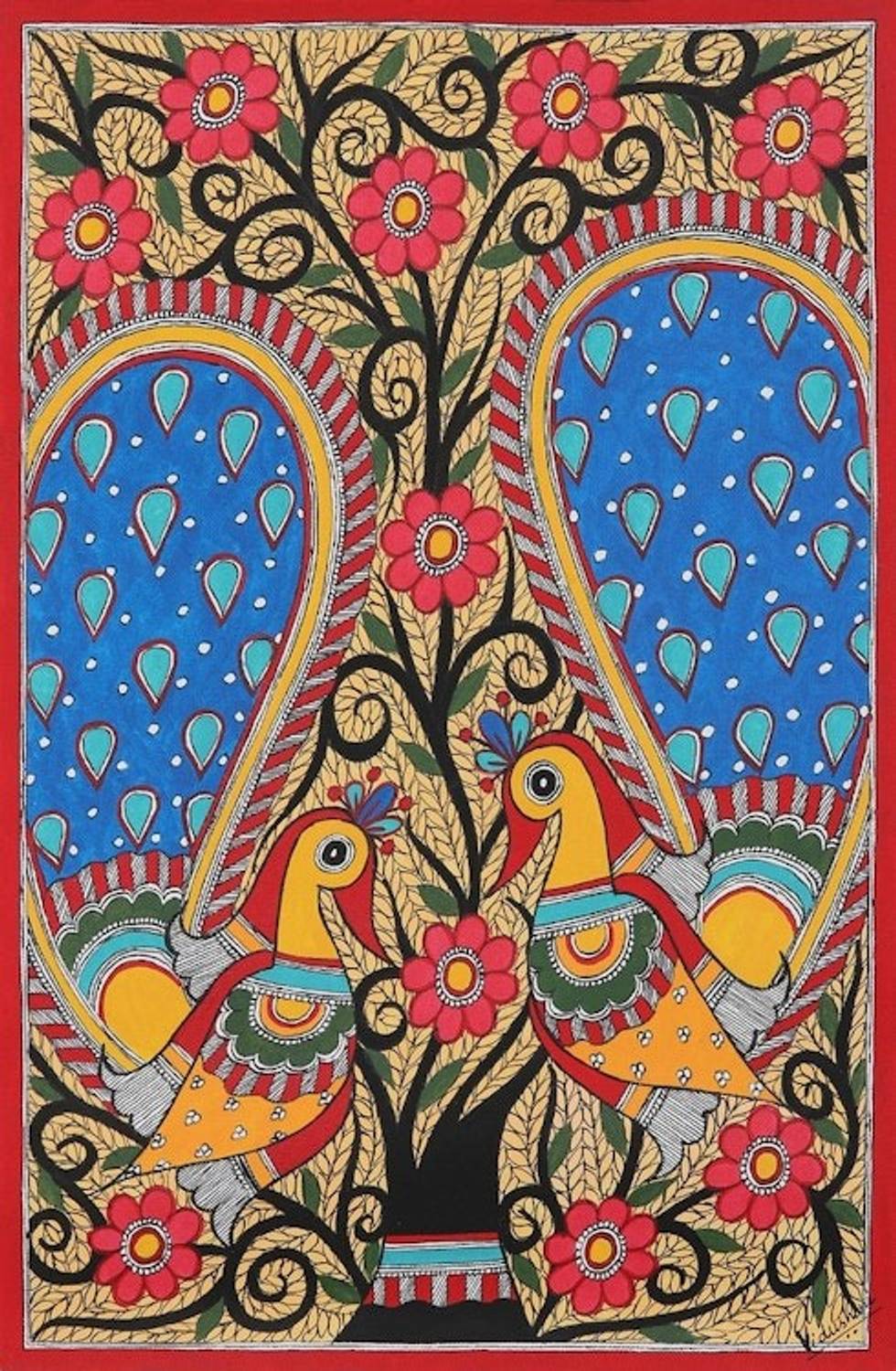 "In Bihar, this art is a ritual that is done on the walls during every wedding. Initially, I used to just fill colors on the designs. Later on, I learned the art by myself. I execute my paintings by using natural colors on handmade paper. Brushes, sharpened reeds, and pen nibs are used to draw the designs and figuration. I also love to do contemporary paintings, while maintaining elements of Madhubani style.
