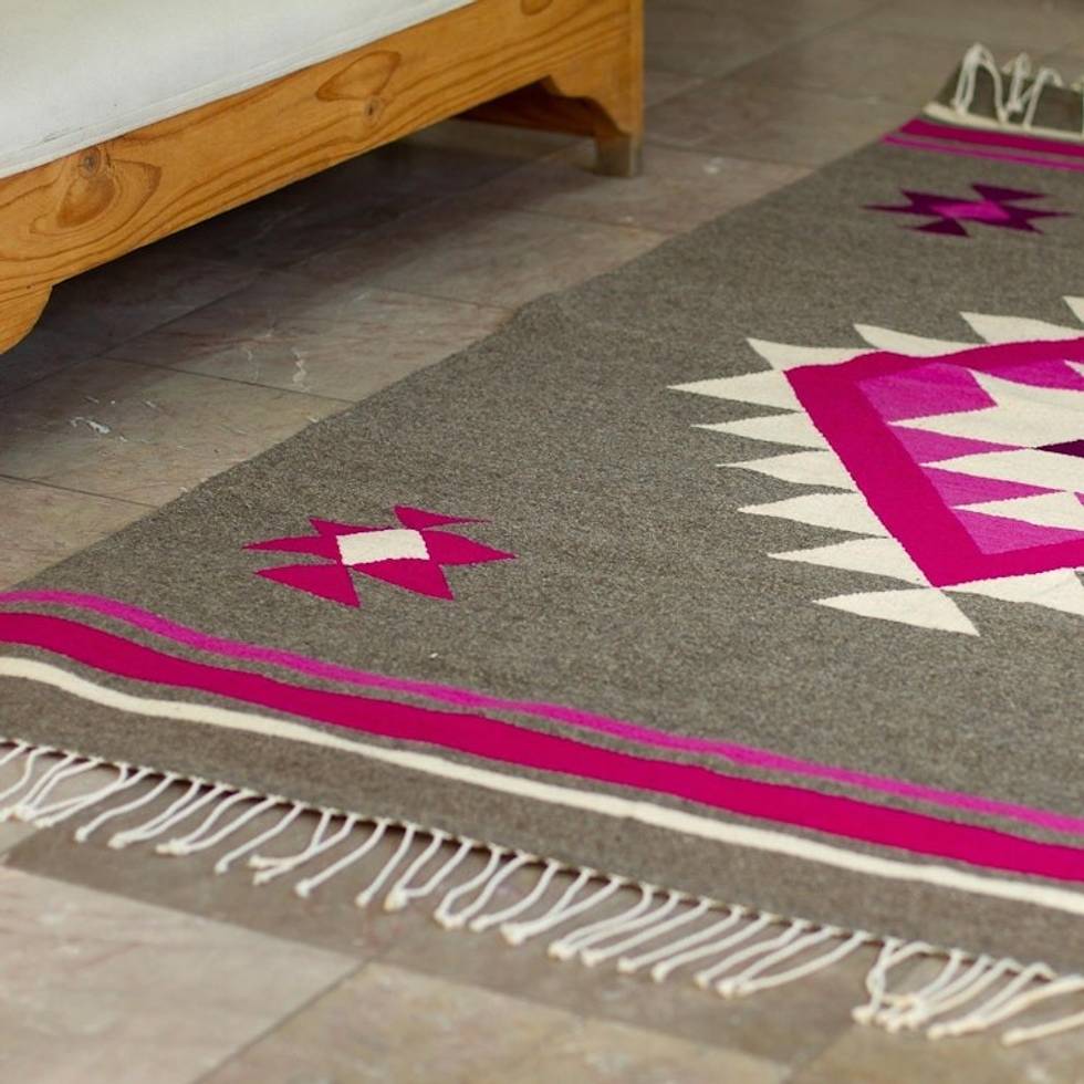 Magenta and Grey Wool Area Rug from Mexico 4x6.5 'Solar Symbol' Item ID: 2671808353