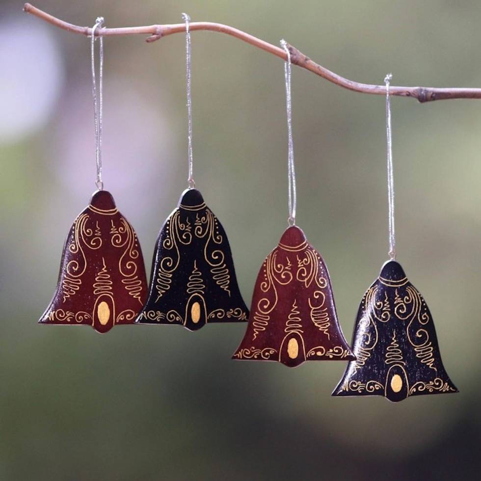Mahogany Wood Hand Painted Bell Ornaments Set of 4 'Joyful Tolling' Item ID: 2671736644