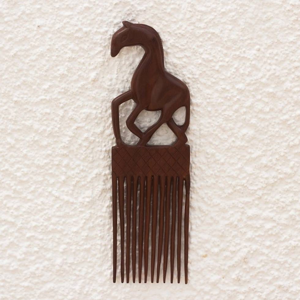 "Perfect for horse lovers, Raphat Asigbey's thoughtfully designed decorative comb makes an elegant piece of home decor. Ghanaian artisans hand carve the horse and comb from rich mahogany wood, prized for its natural luster and durability, before polishing the piece for dark, glossy finish."