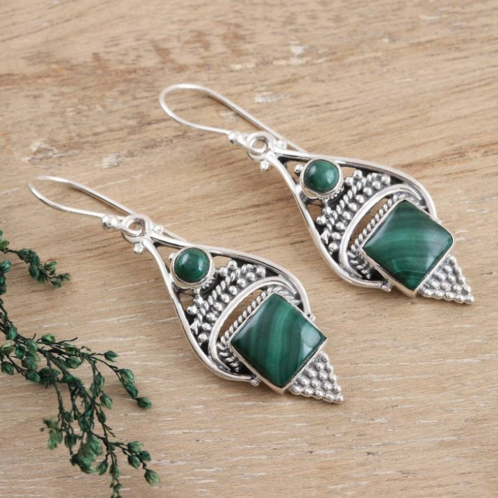 Malachite Cabochon and Sterling Silver Dangle Earrings 'Green Ocean' Item ID: 2669924453