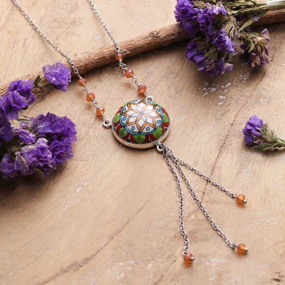 Mandala-Themed Hand-Painted Ceramic and Quartz Y Necklace 'Blossoming Mandala' Item ID: 2671788176