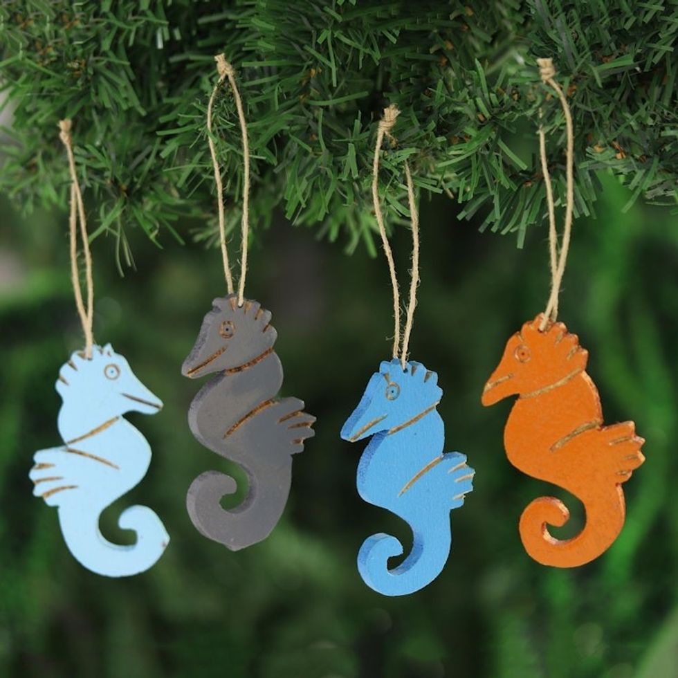 Mango Wood Seahorse Ornaments from India Set of 4 'Colorful Seahorses' Item ID: 2671789914