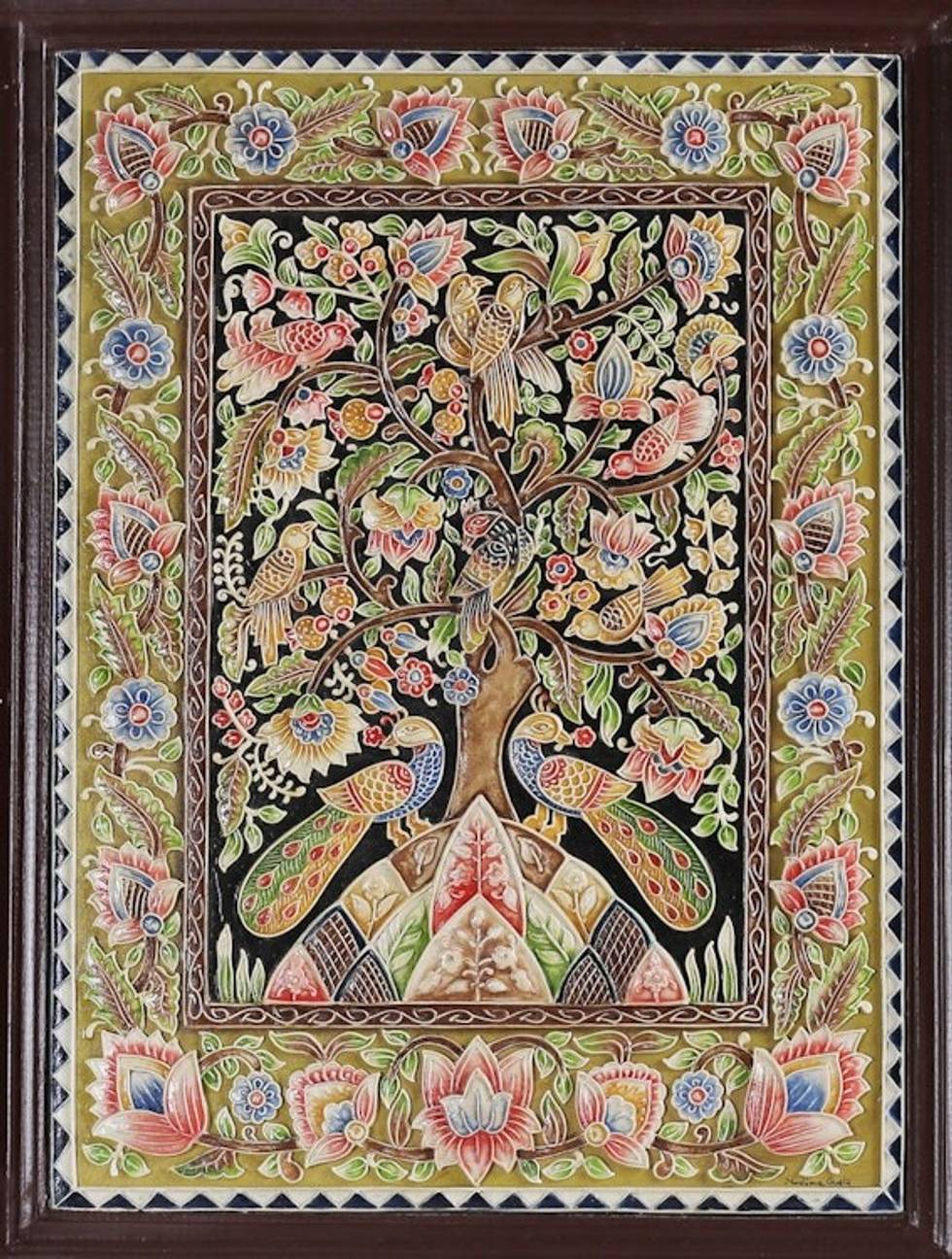 “I use marble powder and mix it with adhesive to create dough, and I prepare a surface on wood or glass. I use the diluted version of the same dough for outlining the painting, by putting it in a cone-shaped plastic wrapper. The tip of the cone is cut and meticulously pressed to create the painting with shape and forms. After the painting is done, I use colors to give life to the painting as per my imagination. The work is very painstaking, and it takes about 7 to 10 days to complete one painting.