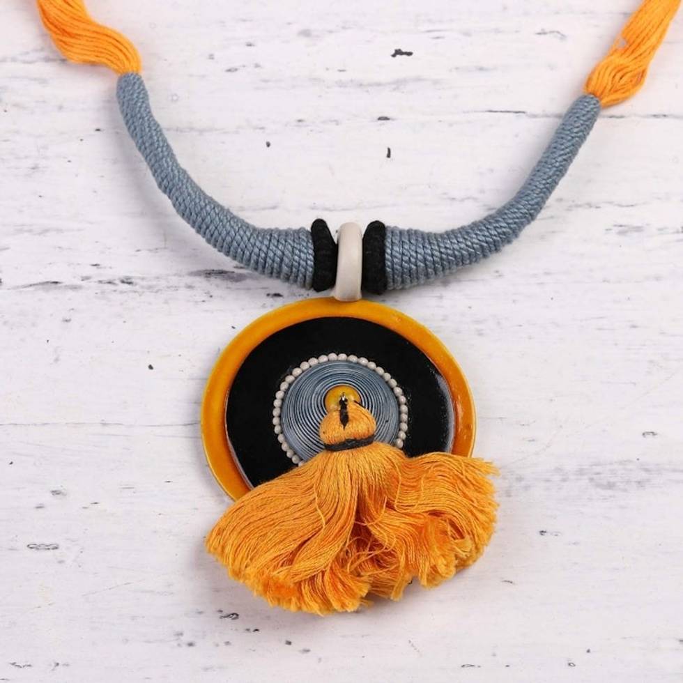 Marigold Ceramic and Cotton Pendant Necklace from India 'Sunset in Kolkata' Item ID: 2671790710