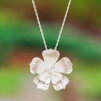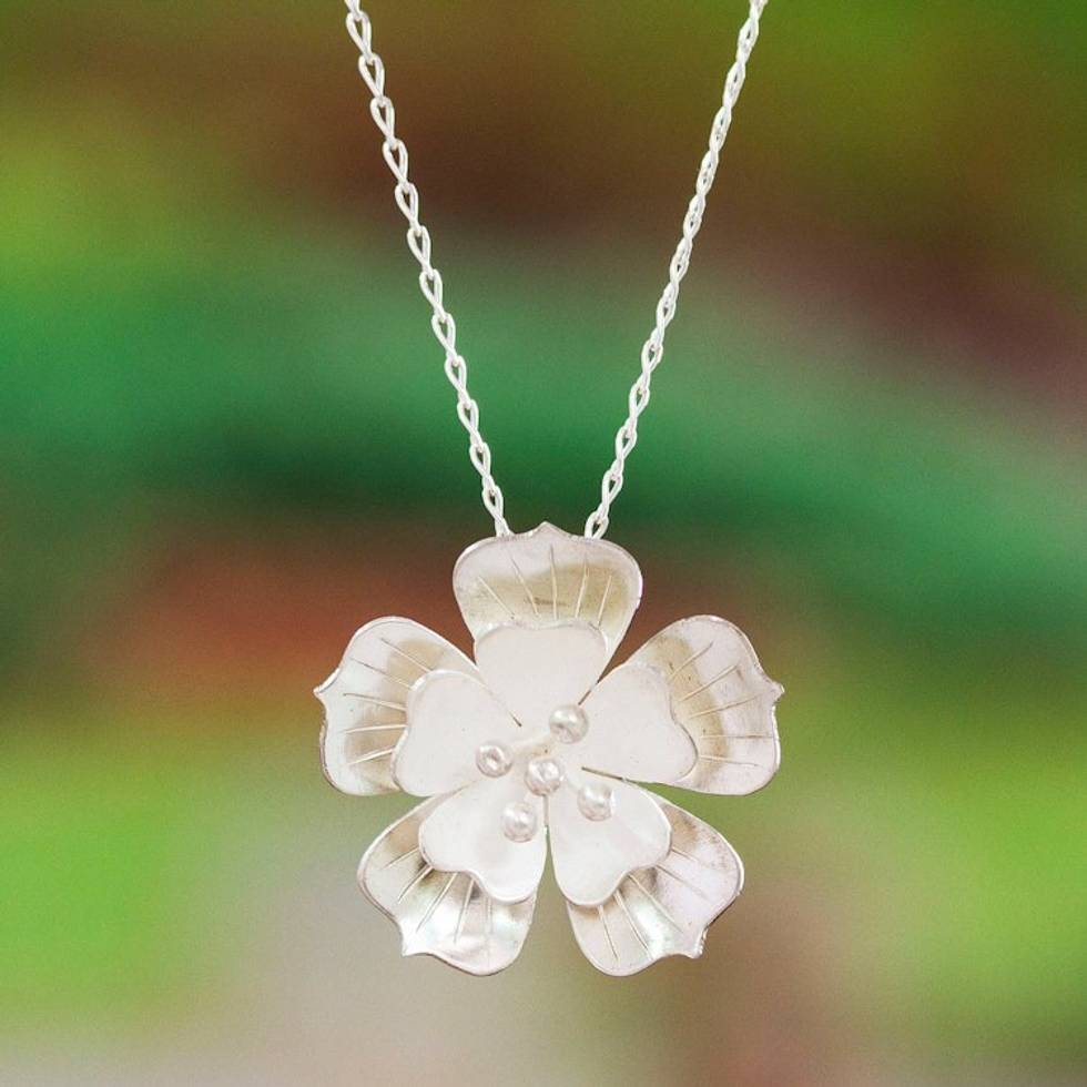 "Delicate sterling silver petals unfold into a stunning peach blossom in this stylish pendant necklace from Mexico's Edna Manzano. Exuding a sense of pure beauty, the pendant effortlessly blends glossy and matte textures, adding an extra touch of refinement to the fabulous design."