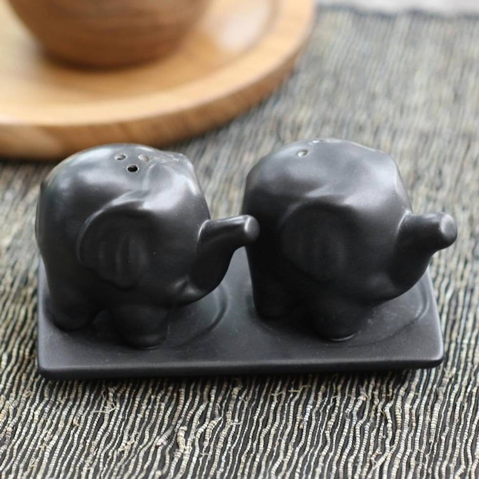 Matte Black Ceramic Elephant Salt and Pepper Set with Tray 'Eager Elephants in Black' Item ID: 2671745190