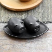Matte Black Ceramic Pig Salt and Pepper Shakers with Tray 'Portly Pigs in Black' Item ID: 2671745044