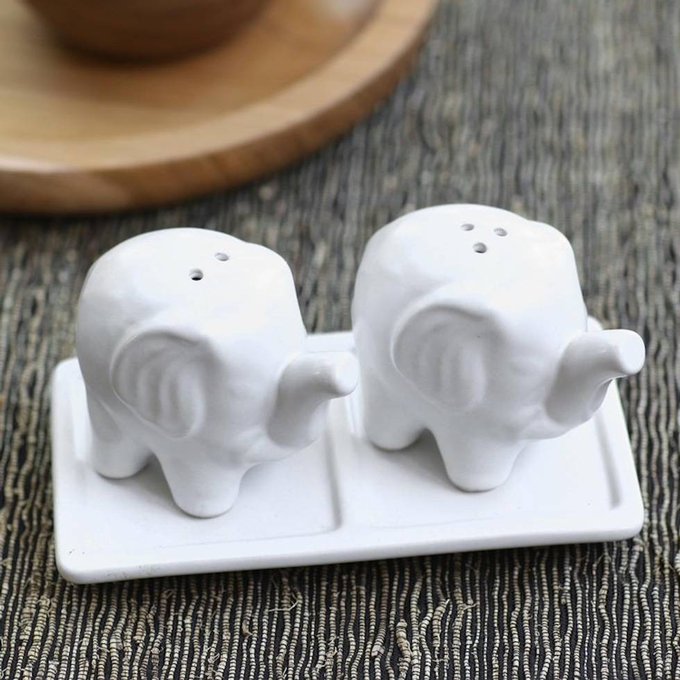 Matte White Ceramic Elephant Salt and Pepper Set with Tray 'Eager Elephants in White' Item ID: 2671745623